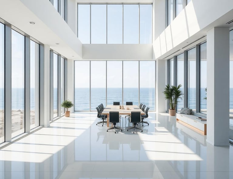 A boutique creative workspace designed around a central light-filled atrium. The minimal material palette allows the quality of space and light to define the experience.